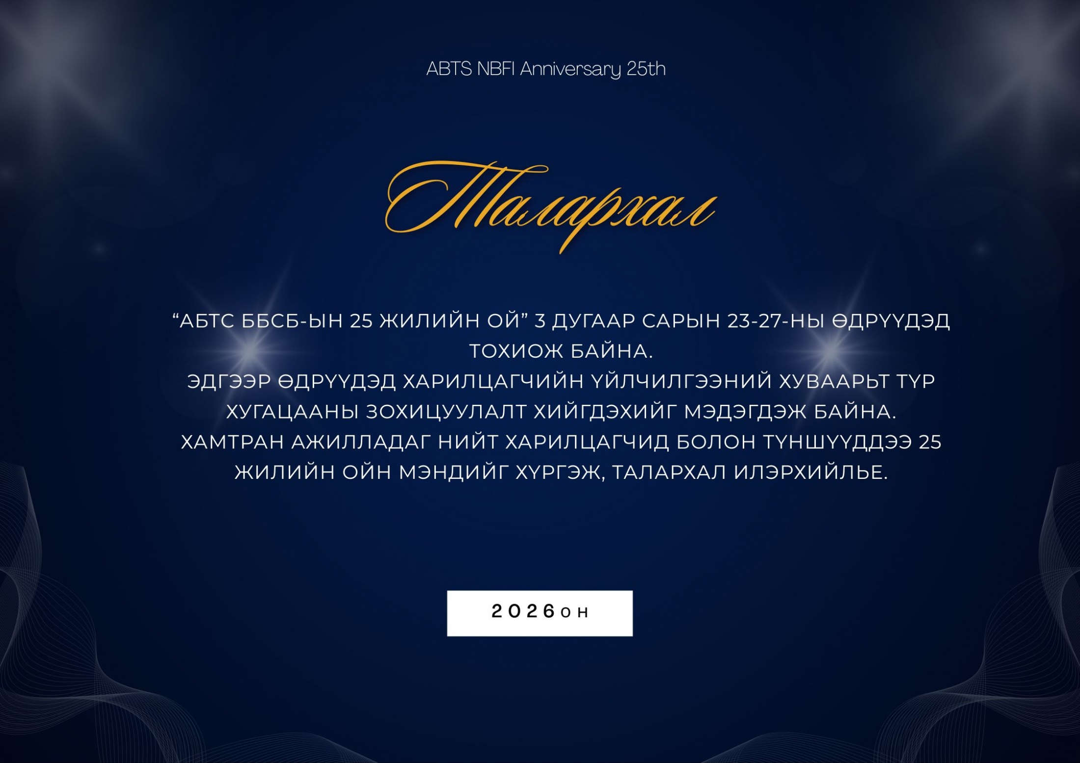As one of the leading NBFI with nearly MNT 79.6 billion loans granted to around 4063 clients throughout the 23 years of operation in the field, ABTS NBFI offers quality service, relatively low interest rate and flexible maturity to our customers.
